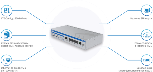 // Це багатофункціональний пристрій працює на базі RutOS і є ідеальним вибором там, де потрібне швидке і наднадійне з'єднання (наприклад, в корпоративному середовищі).